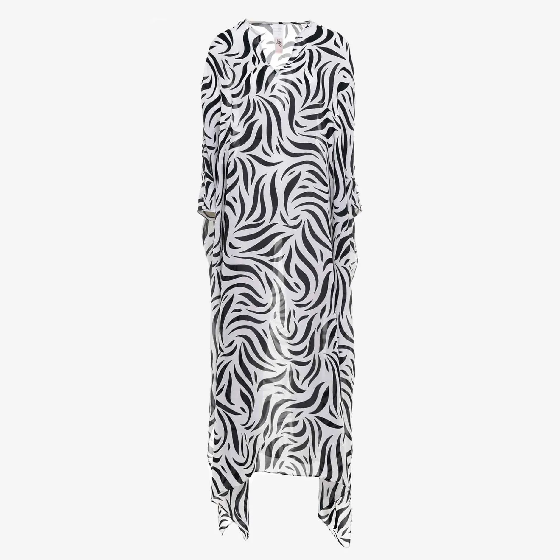 Issimo X Loretta Caponi’S Long Sleeves Kaftan On Full Length Realized In Black And White Zebra Printed Pure Silk Georgette. Inspired By Ml’S Childhood Friends And The Colors Of Rome. One Size Fits All.